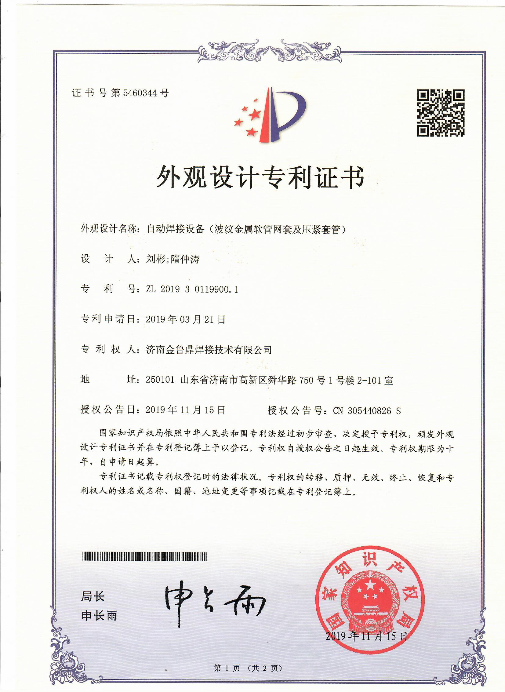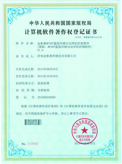 2016年获得“金鲁鼎HF30T氩弧环缝自动焊机控制软件”软件著作权登记证书